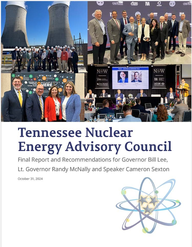 On November 21, 2024, the Tennessee Nuclear Energy Advisory Council released its final report on advancing nuclear energy innovation in the state. The report outlines 19 recommendations around addressing first-of-a-kind costs for small modular reactors (SMRs), growing a strong supply chain, and coordinating and enhancing workforce development, regulatory responsiveness, and coalition building. A primary conclusion centered around the Clinch River SMR under development, the potential long-term benefits, and the need for the State to actively coordinate with the Tennessee Valley Authority (TVA) throughout the process.