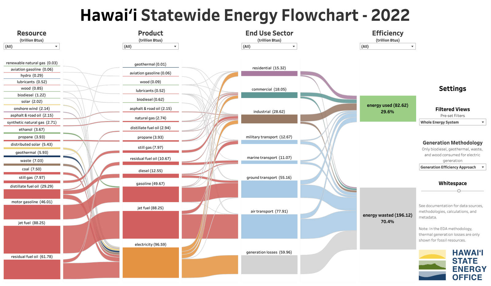 Utilizing primarily publicly available data from the state and federal governments, the interactive data visualization illustrates the journey of energy resources to final consumption. Currently, the flowchart depicts data from 2022, but updates to include data from 2023 are expected Spring 2025. Funding from the U.S. Department of Energy's State Energy Program supported the Hawai'i State Energy Office for both software and initial work from the Data Science Institute Fellows.